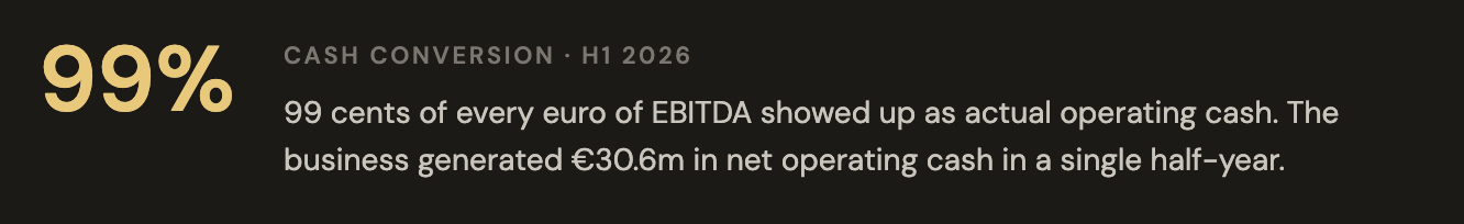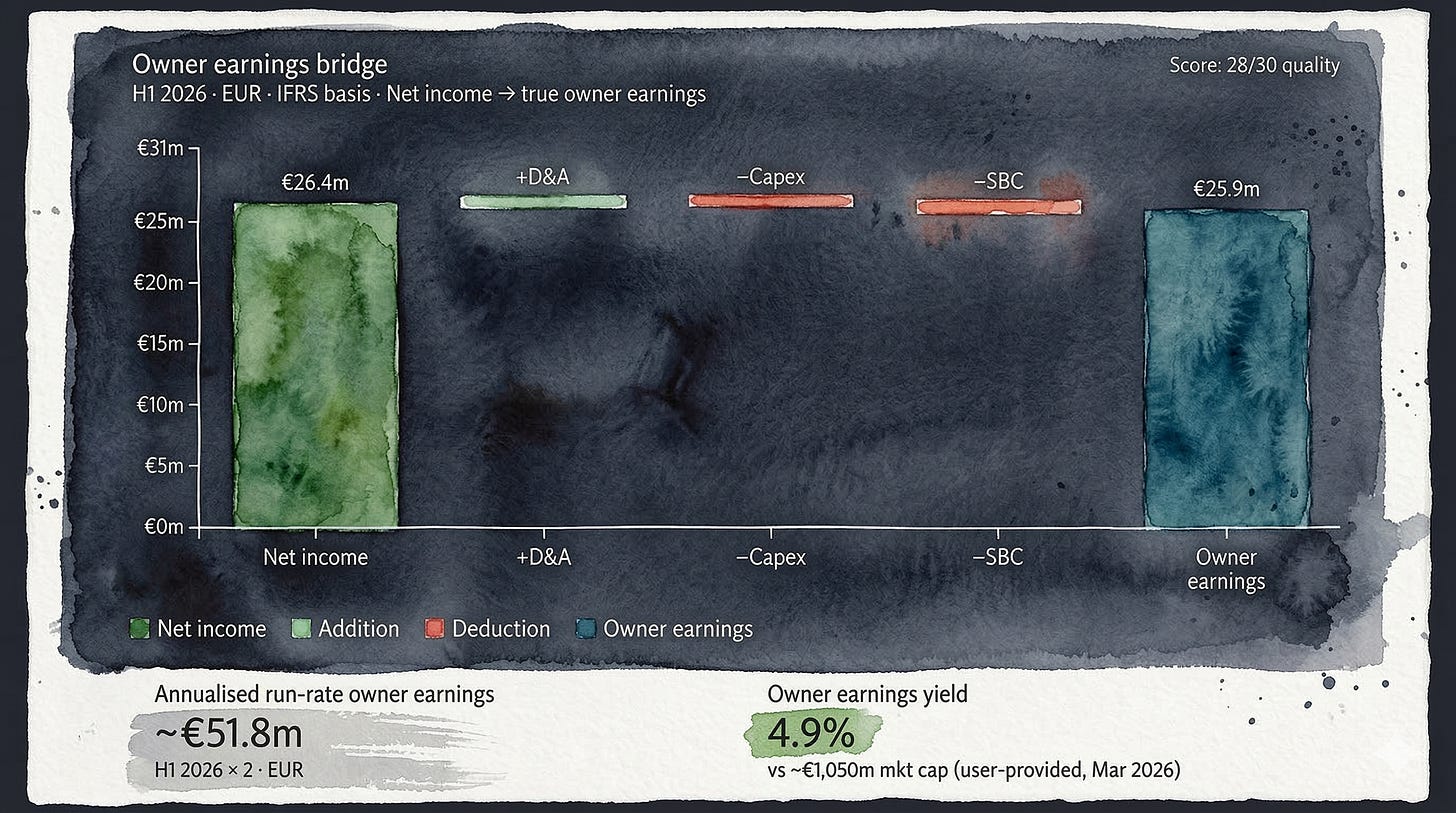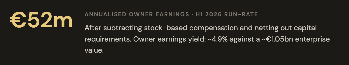 Strip out stock compensation as the real cost it is, net out the minimal capital requirements, and owner earnings come to roughly €52m annualised. Against an enterprise value (EV) of approximately €1.05bn, that is a 4.9% yield on a business moving to zero debt with 99% cash conversion.