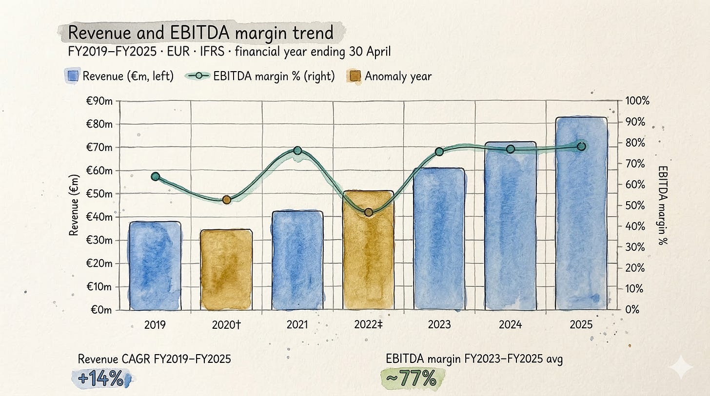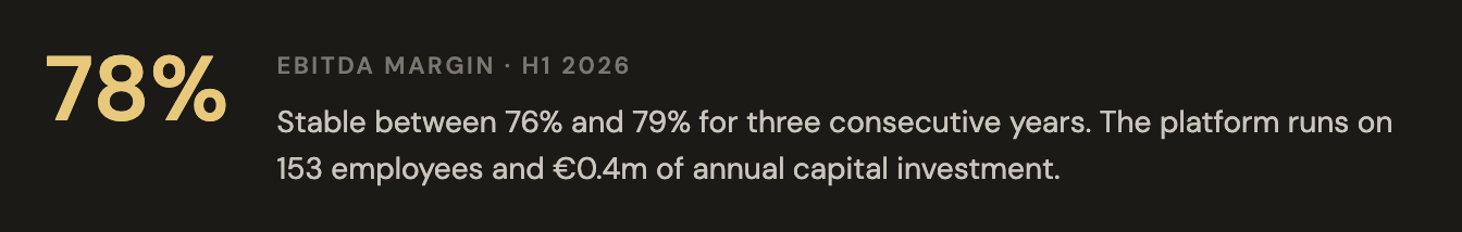 In the six months ended October 2025, BCG collected €44.8m in revenue. It spent €9.7m running the operation: salaries for 153 people, some third-party IT, modest marketing, a small amount of data costs. The remaining €35.2m was EBITDA.