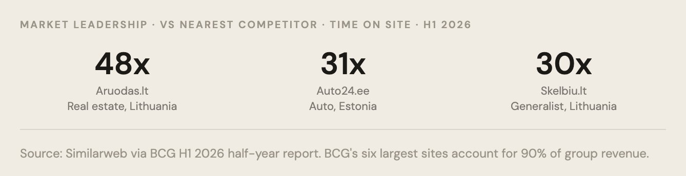 BCG has been spinning this flywheel since 1999. Its real estate portal in Lithuania now leads the nearest competitor by 48 times on time spent on site. Its auto portal in Estonia leads by 31 times. These numbers are not the result of clever marketing. They are the mathematical consequence of a flywheel that has been running for twenty-five years.