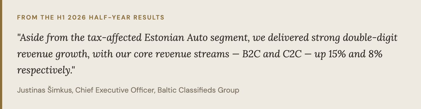 Against the actual number of listings on the platform today, it is a policy-specific correction in one country. Management has confirmed year-on-year Auto growth is expected to resume from January 2026. Not because Estonians suddenly start buying cars again in volume, but because you are now comparing against the already-collapsed numbers from a year ago.